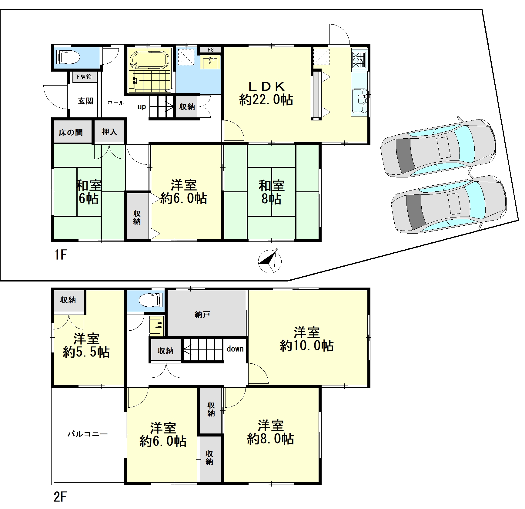 7SLDK (LDK:22帖×1室 、洋室:10帖×1室 、洋室:8帖×1室 、洋室:6帖×2室 、洋室:5.5帖×1室 、和室:8帖×1室) |