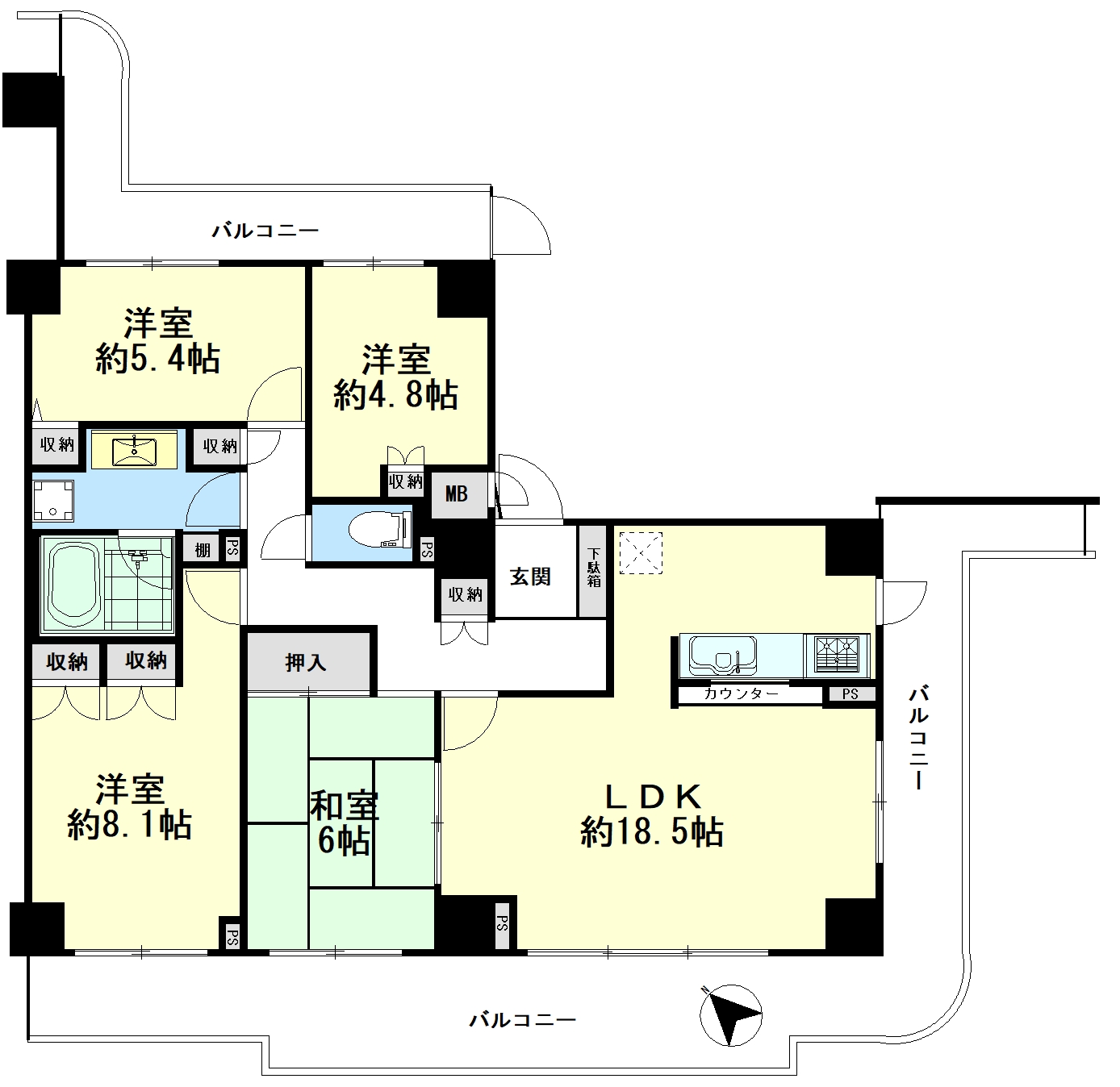 4LDK (LDK:18.5帖×1室 、洋室:8.1帖×1室 、洋室:5.4帖×1室 、洋室:4.8帖×1室 、和室:6帖×1室 ) |