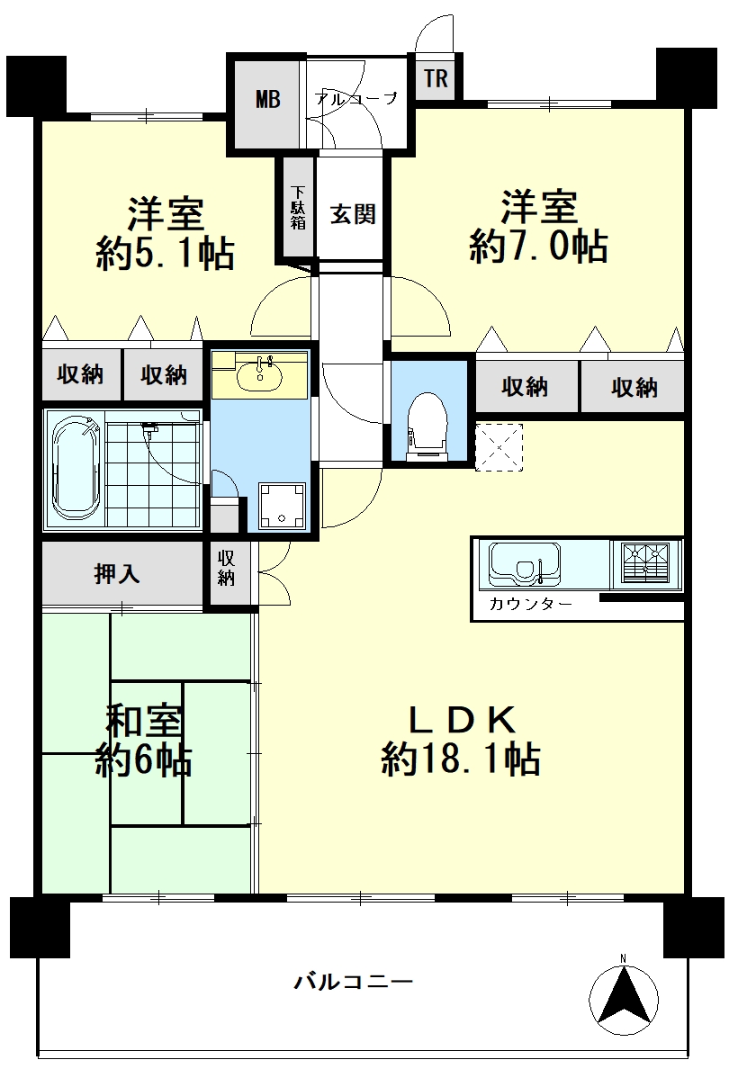 3LDK (LDK:18.1帖×1室 、洋室:7帖×1室 、洋室:5.1帖×1室 、和室:6帖×1室 、洋室:6帖×1室 ) |