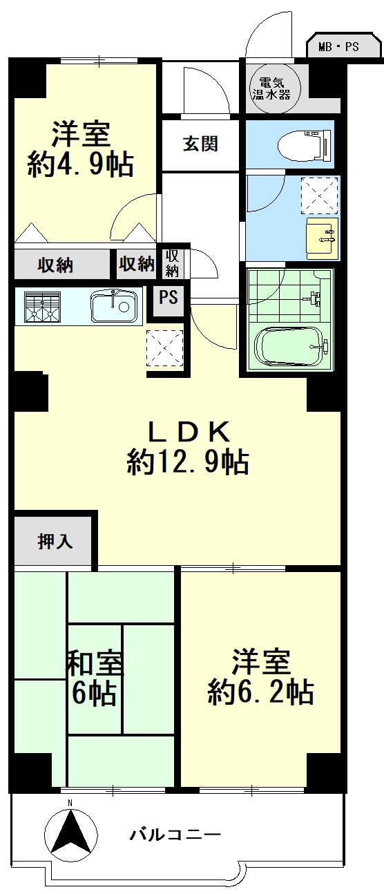 3LDK (LDK:12.9帖×1室 、洋室:6.2帖×1室 、洋室:4.9帖×1室 、和室:6帖×1室 ) |