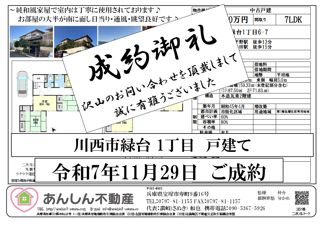 成約御礼 川西市緑台一丁目 戸建て